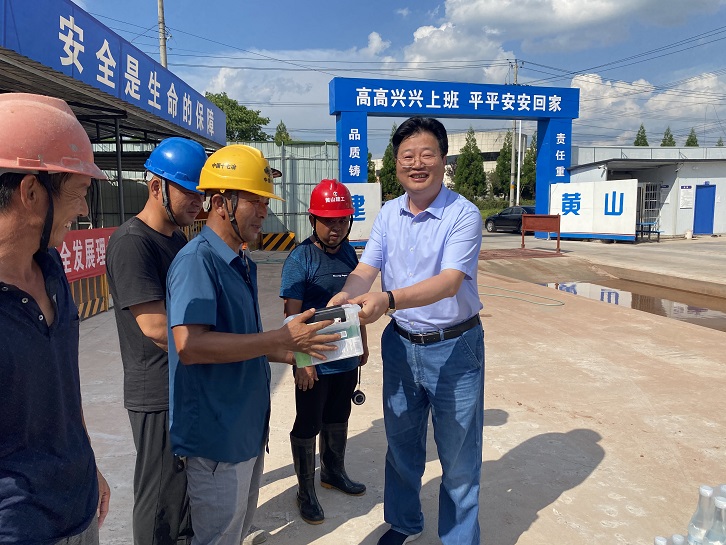 在黃山市南部城鎮(zhèn)群水務調(diào)度中心項目、黃山生豬定點屠宰加工及配套設施項目及配套冷鏈項目施工現(xiàn)場,城投集團總裁黃世穩(wěn)、黨委副書記汪蓉、副總裁朱愛民等一行將慰問品送到一線職工手中,并和大家親切交談,細致了解大家的生活工作情況,總裁黃世穩(wěn)叮囑要注意勞逸結合,合理安排作息時間,做好防暑降溫工作,確保實現(xiàn)安全生產(chǎn)。