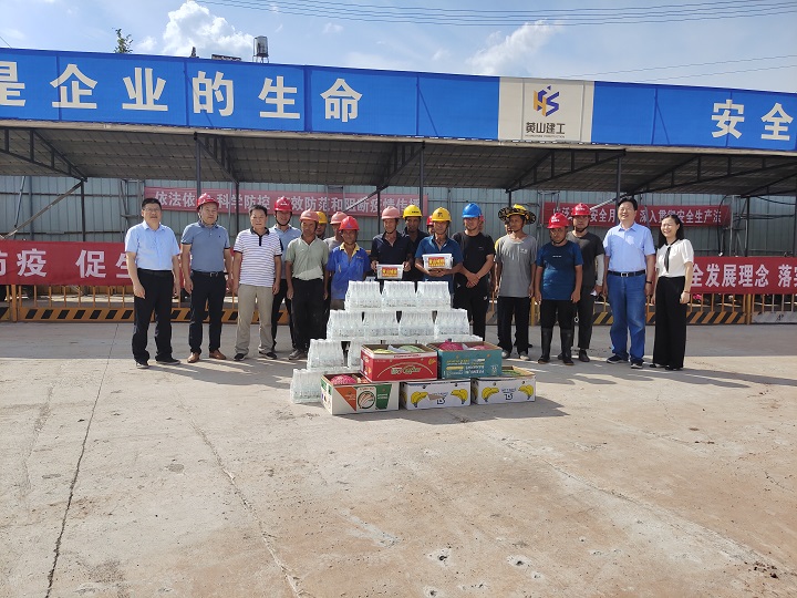 7月21上午,業(yè)主單位黃山市城投集團黨委書記、董事長陳杰、總裁黃世穩(wěn)等一行分組帶隊到我公司承建的黃山市危險(含醫(yī)療)廢物集中處置中心易地重建工程、黃山市南部城鎮(zhèn)群水務調(diào)度中心項目、黃山生豬定點屠宰加工及配套設施項目及配套冷鏈項目施工現(xiàn)場送來了人丹、十滴水、礦泉水、西瓜等防暑降溫用品,并向奮戰(zhàn)在一線的施工人員及項目部管理人員表示了親切的慰問和感謝,對一線人員頭頂烈日不畏酷暑的精神給予了贊揚。