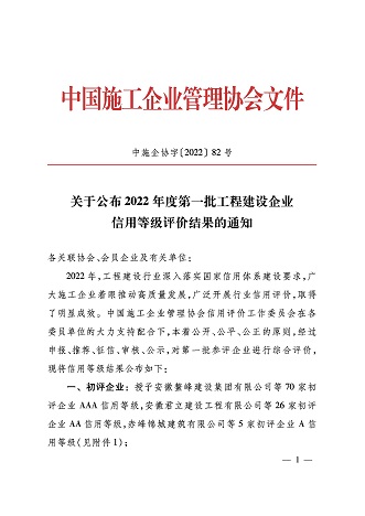 2022年,黃山市建工集團股份有限公司再次榮獲施工企業(yè)最高信用評級“AAA級企業(yè)信用證書”。這是對黃山市建工集團股份有限公司持續(xù)積累的經(jīng)營管理能力、合同履約能力、市場競爭能力及優(yōu)質(zhì)社會形象的權威認證。