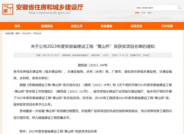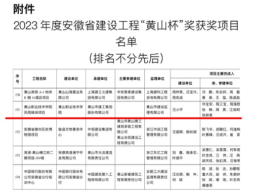 7月25日,省住建廳公布2023年度安徽省建設(shè)工程“黃山杯”獎(jiǎng)獲獎(jiǎng)項(xiàng)目名單,黃山建工承建的黃山職業(yè)技術(shù)學(xué)院風(fēng)雨操場項(xiàng)目工程位列榜單、喜獲殊榮。