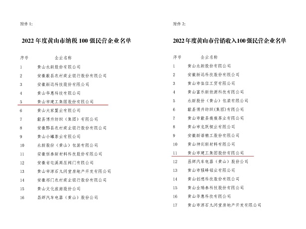 日前,由黃山市工商聯(lián)、市經(jīng)信局、市監(jiān)管局及市商務局聯(lián)合發(fā)布2022年度黃山市民營企業(yè)納稅及營銷收入百強名單公布,黃山建工集團連續(xù)多年再次實力入圍,獲此殊榮!