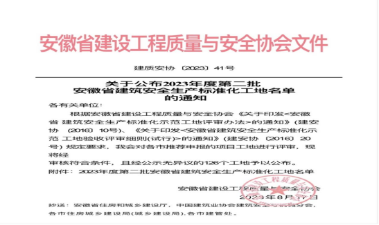 8月17日,安徽省建設(shè)工程質(zhì)量與安全協(xié)會發(fā)布2023年度第二批安徽省建筑安全生產(chǎn)標(biāo)準(zhǔn)化工地名單,黃山建工集團仙人洞南路東側(cè)D1地塊(文瀾軒)項目獲評“安徽省建筑安全生產(chǎn)標(biāo)準(zhǔn)化工地”。